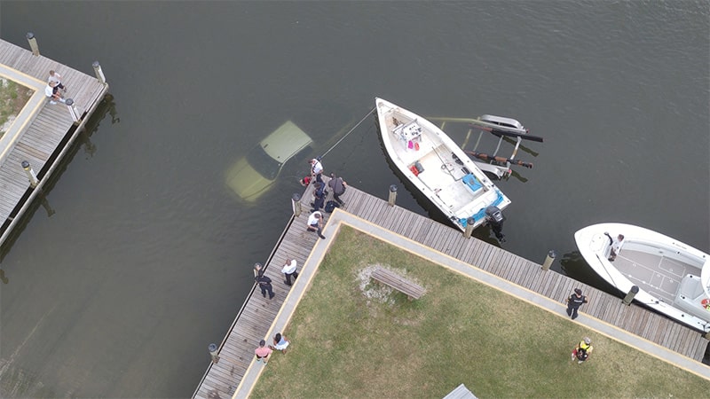 The Marina Boat Ramp, located adjacent to the Historic Venice Train Depot, is closed while Sea Tow Venice, along with a Venice Wrecker service, works to retrieve the submerged vehicle.